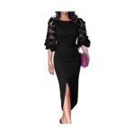 Bodycon Midi Dress for Women Mesh Puff Sleeve Slit Work Cocktail Wedding Dresses with Belt